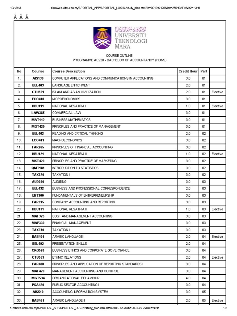 PROGRAMME ACC220 - BACHELOR OF ACCOUNTANCY No Course Course Description Credit Hour Part Elective 01. Earn Free Access Learn More Upload Documents. Level 2 UiTM-MTDC Technopreneur Centre Universiti Teknologi MARA UiTM 40450 Shah Alam Selangor Malaysia icepsuitmedumy Tel.